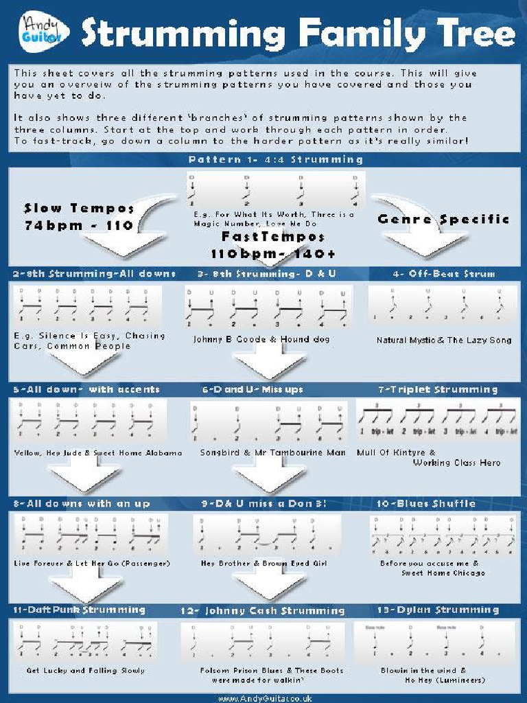 Learn these 16 strum patterns and youll be able to play along to tons of cool songs. Go from stiff to fluid with twenty of the most recognizable strumming patterns from the past four decades. From the contagious groove of Bo Diddley to the classic Oasis-style grooves of the 1990s these patterns are sure to challenge your rhythm sense and reward your efforts.